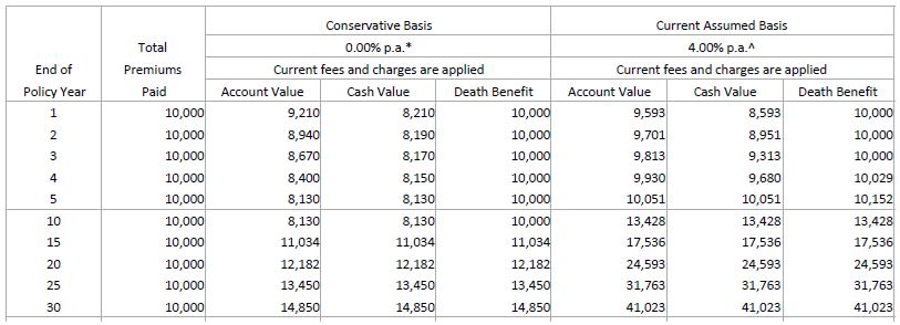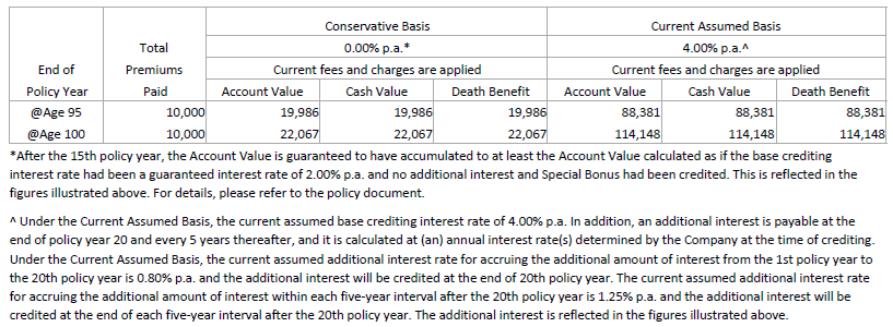 右上の「Current Assumed Basis」は現行の標準利回りです。あれれ…、(A)は年利4.5%なのに(B)は4.0%に低下、なのに15年目以降の「Cash Value(解約返戻金)」や「Death Benefit(死亡保険金)」は(B)が多いってどういうこと…?